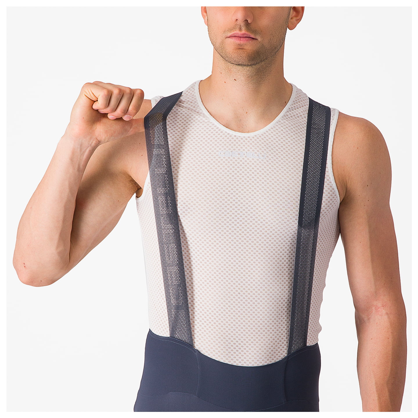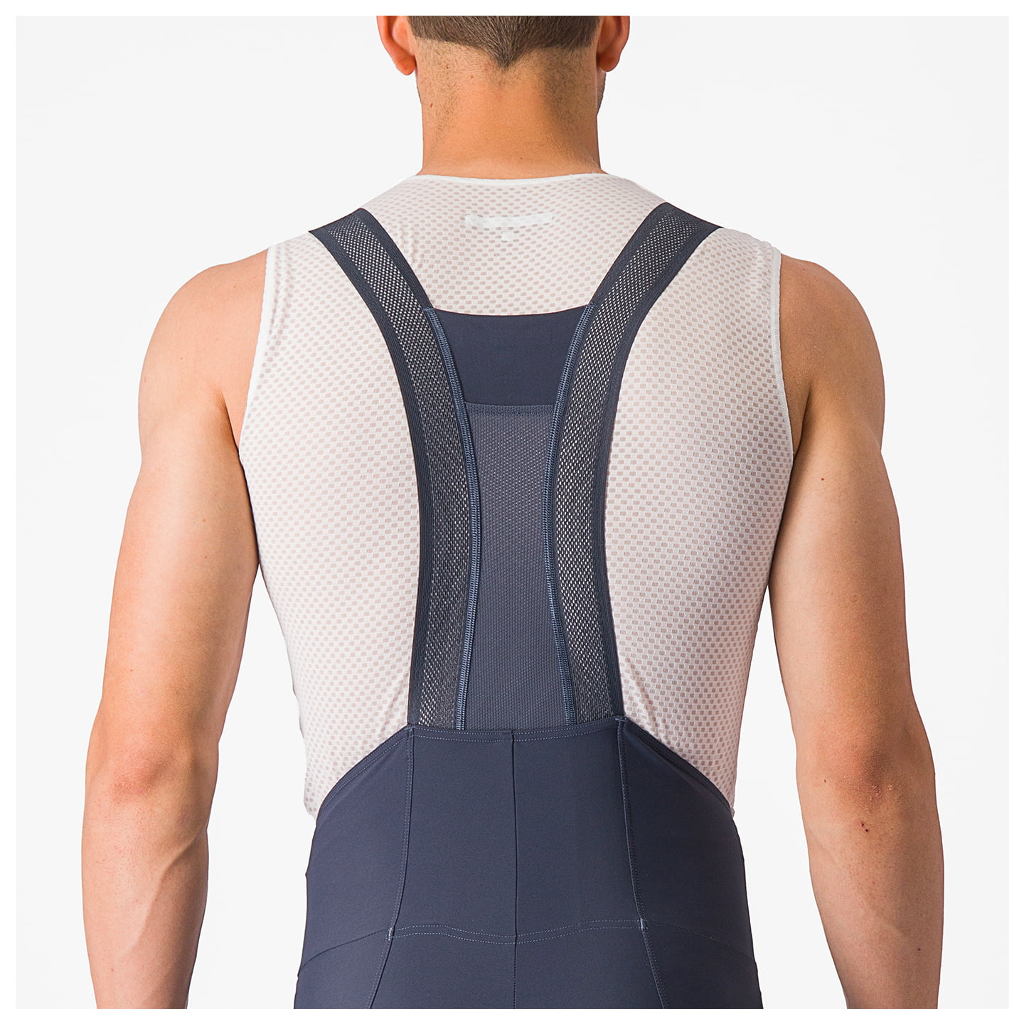 - minimalist bib section with mesh elastic straps and mesh back