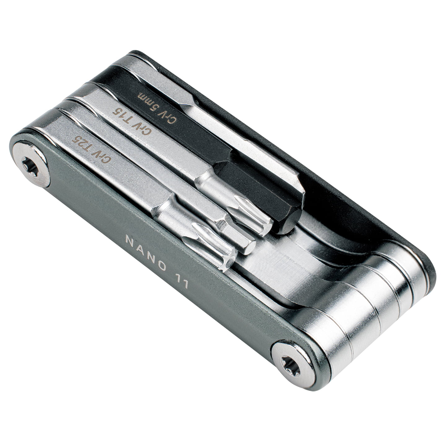 The Nano 11 mini tool is an elegant, super small and handy multifunctional tool. It impresses with its high-quality body made from CNC-milled 7075 aluminum. With the Nano 11 mini tool, you have 11 functions to hand: 7 Allen keys, 3 Torx keys and 1 flat-head screwdriver. The clever combination function is particularly practical, turning a 5 mm hexagon socket plus flathead screwdriver into an 8 mm hexagon socket.