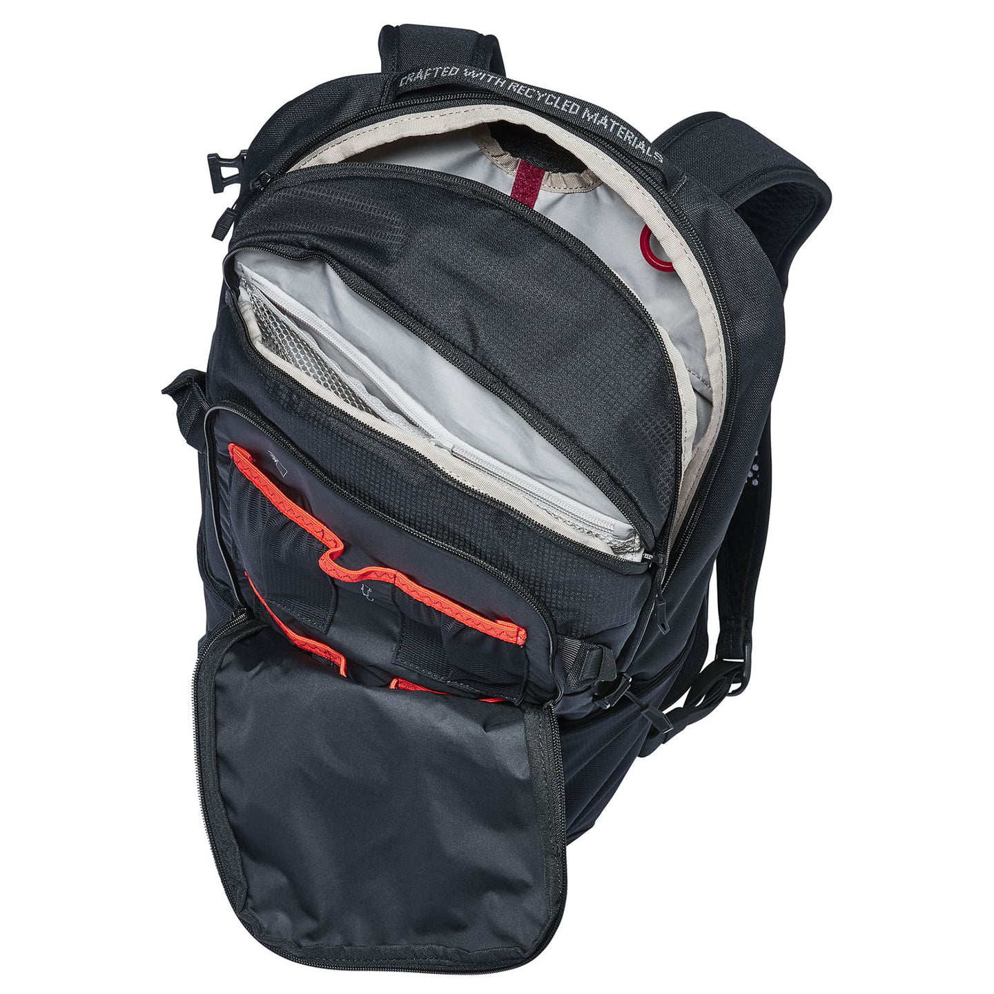 Functional, compact Enduro backpack with breathable back system and well conceived stowage possibilities. This backpack with its ergonomic back plate and shoulder straps features a very firm fit and is precisely adjustable. The backpack is manufactured mainly from recycled fibres and thus contributes to safeguarding the environment.