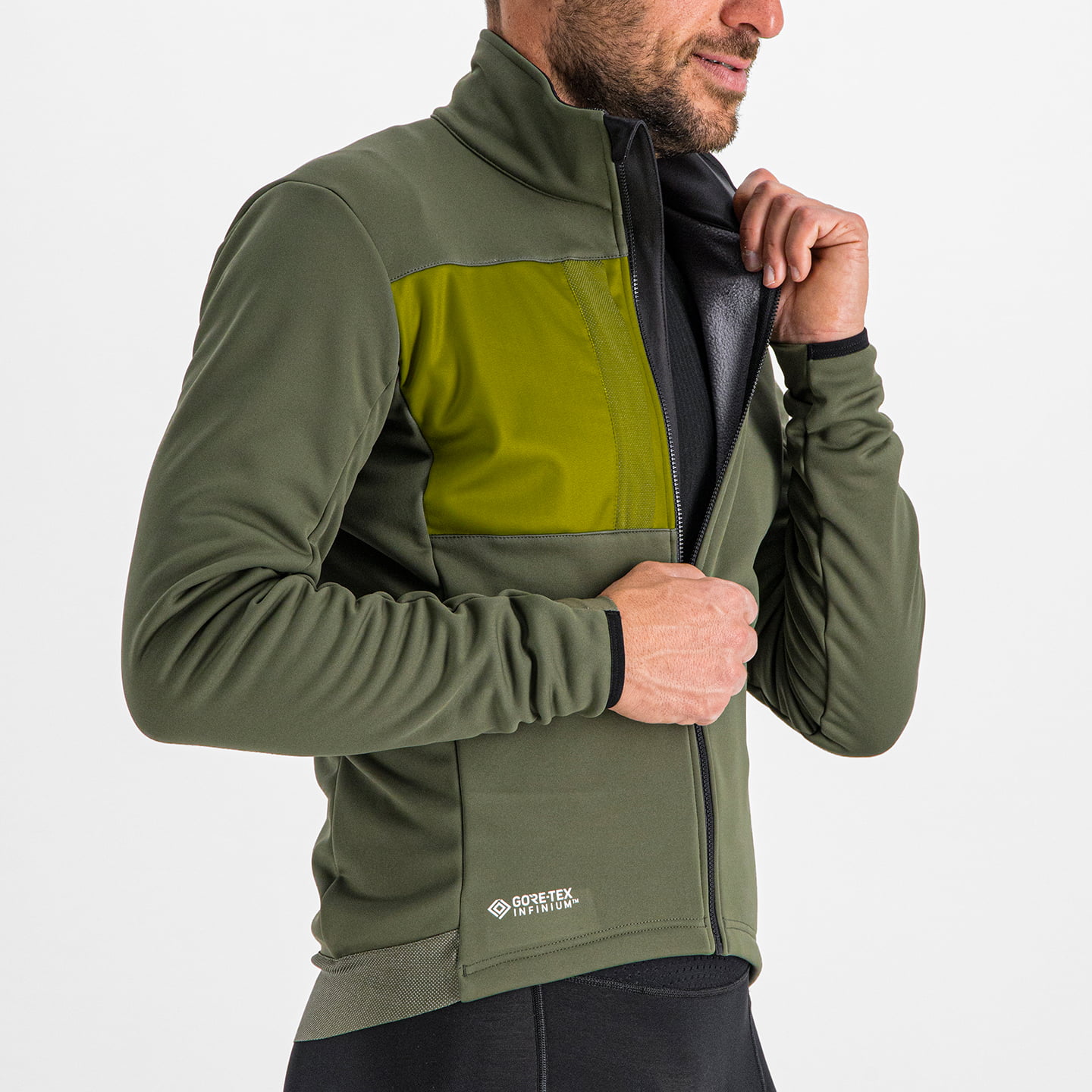 - completamente de Softshell Gore-Tex Infinium ligero, altamente elástico, impermeable al viento y repelente al agua con interior suave en fleece fino